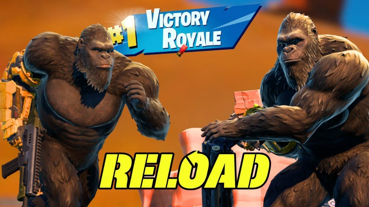 The two ape-like game characters have expressions of determination or focus, which aligns with the serious action implied by 'RELOAD' and 'Victory Royale.' However, as game characters, their emotional range is limited, and they don't display intense triumph, shock, or frustration. The color scheme (orange background, yellow text) is energetic but doesn't inherently carry strong emotional weight beyond that. To inject more emotion, consider a more dynamic pose for the characters, perhaps showing one mid-action with greater urgency or the victorious character in a more triumphant stance. Dramatic lighting or particle effects could also evoke stronger feelings.